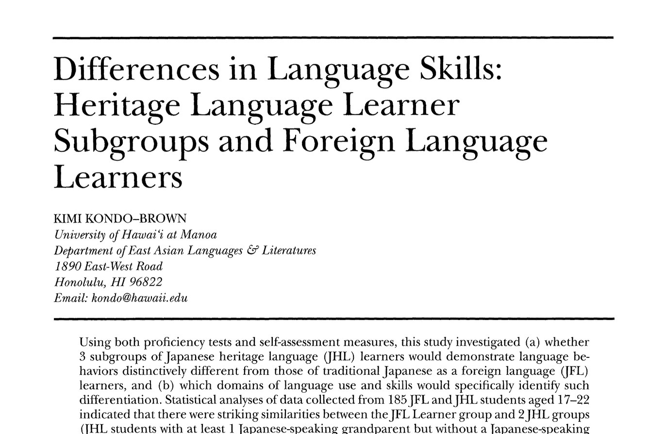 - Kondo-Brown, K. (2005). Differences in language skills: Heritage Language Learner Sub-groups and Foreign Language Learners. The Modern Language Journal, 89, 563-581.