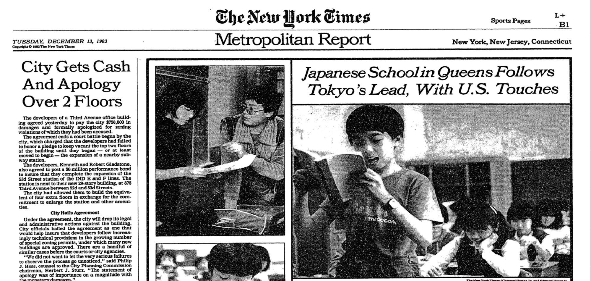 今、北米には4校の全日制日本人学校がありますが、そのうち2校はニューヨーク周辺にあります(ニュージャージ日本人学校とニューヨーク日本人学校)。これらの学校は、もともと1970年頃から増加してきた日本からの一時駐在家庭の子どもたちの教育のために設立された経緯があります。現在、ニューヨーク日本人学校はコネチカット州のリバーデールにありますが、設立当初はニューヨーク市内にあり、1980年代にはクイーンズにも全日制日本人学校が存在していました。また、それとは別に、現地校に通う日系の子どもたちのための補習校がニューヨーク各地にあったそうです(記事によれば12校もあったとのことです)。